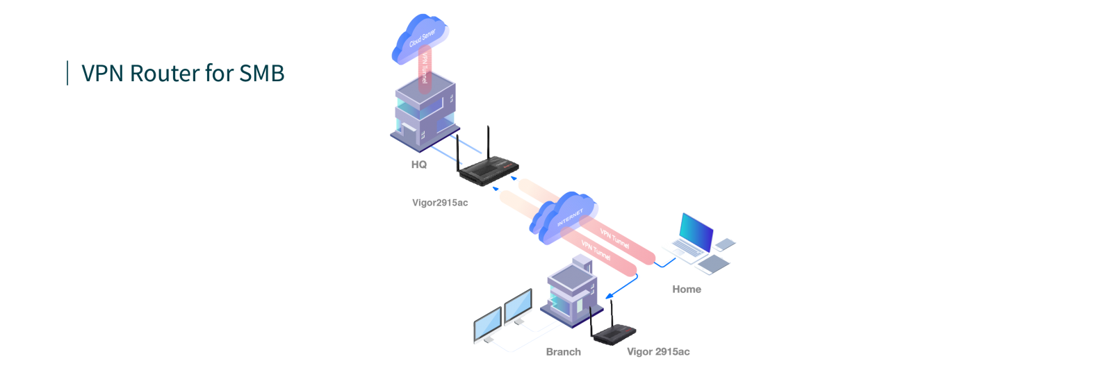 Từ trước đến nay, tính năng VPN luôn là một thế mạnh ở các dòng sản phẩm của DrayTek. Kế thừa điều đó, với 16 kênh VPN kết nối đồng thời (trong đó có tối đa 8 kênh SSL VPN đồng thời) và băng thông VPN tối đa lên đến 200 Mbps (IPsec AES 256 bits), DrayTek V2915ac thực sự là router VPN tối ưu cho các doanh nghiệp vừa và nhỏ để triển khai giải pháp Work from Home(WFH) và kết nối các văn phòng chi nhánh với nhau.